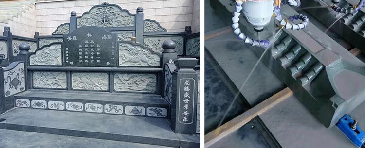 殯葬行業:廣泛應用于套碑及圈墓構件雕刻,主要用于碑帽、碑柱、欄板、圍板、石獅的批量加工,亦可用于碑文刻字、各種線雕工藝;碑帽以琉璃瓦或各種龍鳳浮雕加工居多、碑柱多以半圓盤龍柱或柱聯。