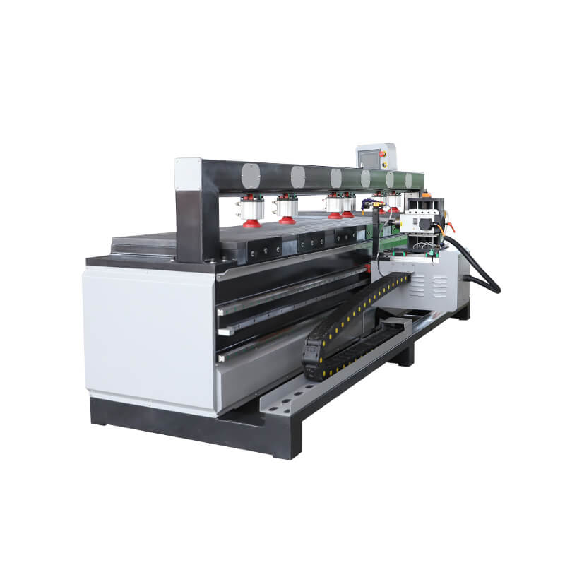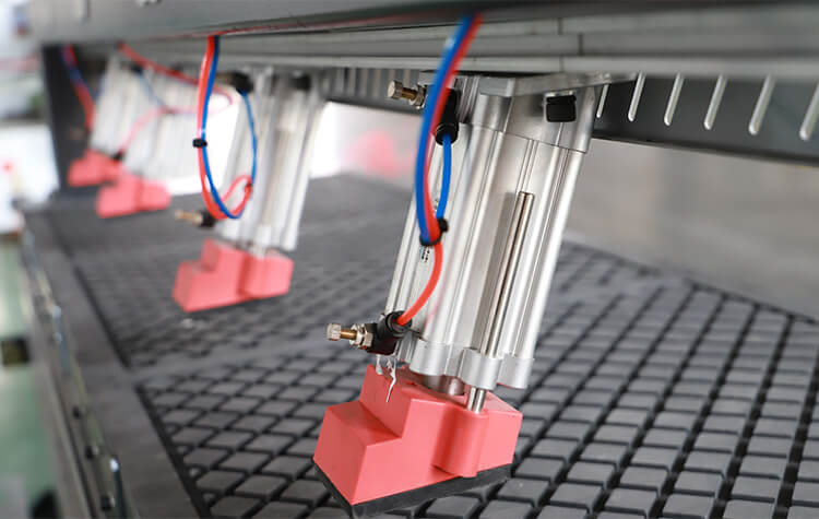 (3)床身加重,前端獨特“L”型設計,針對長版材短邊加工。整機壓緊為全氣缸作業(yè),操作方便。間隔式定位樁適用各種大小板材。